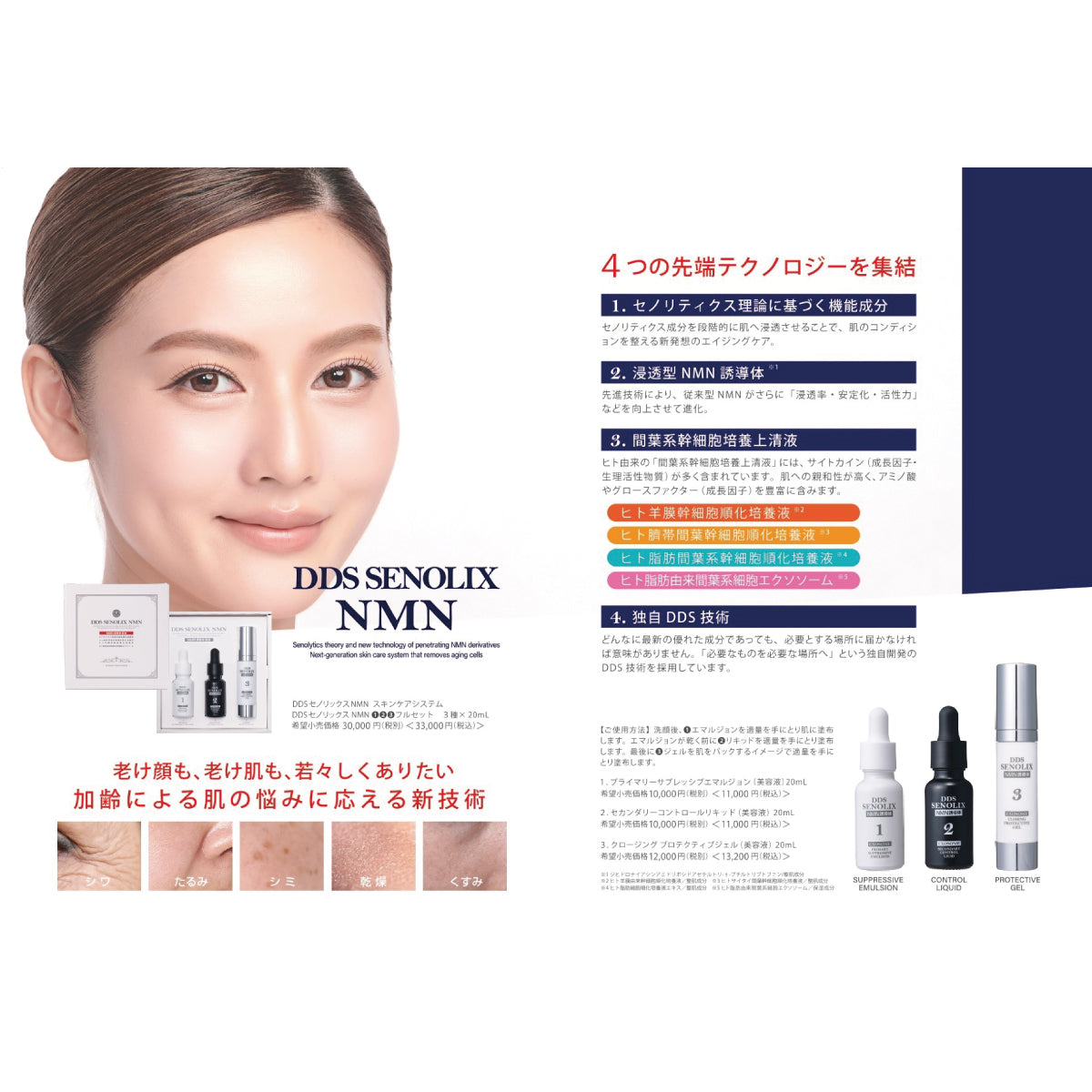 私たちはセノリティクス理論をスキンケア・ヘアケアに応用し、セノリティクス成分を段階的に肌へ浸透させることで、肌のコンディションを整える新発想のエイジングケア「DDS SENOLIX NMN」を開発しました。